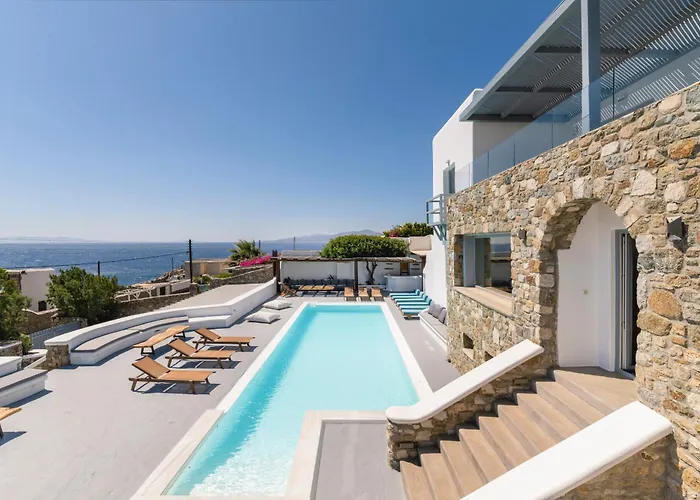 De 6-badkamer villa is binnen 25 minuten wandelen van de Nieuwe Haven van Mykonos gelegen.